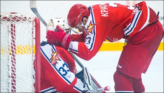 В параллельном матче «Звезда» от души покуражилась, разгромив «Спутник» со счетом 9:1. Каждый третий бросок хозяев становился голом, примечательно также то, что форвард Максим Рыжков, который до этого дня ни разу не забивал за «Звезду», отметился сразу тремя шайбами.