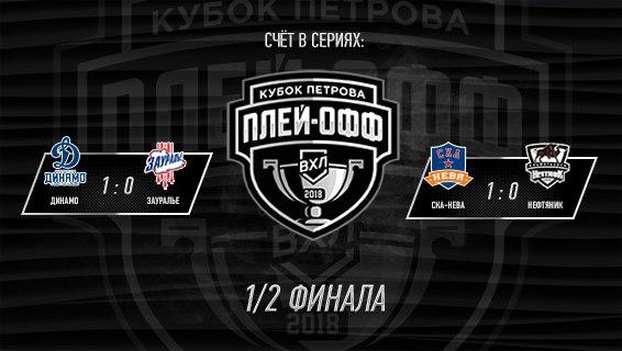 В четверг Санкт-Петербург стал центром хоккея - в одно и то же время здесь шло три матча. СКА принимал ЦСКА в КХЛ в полуфинале Кубка Гагарина, а «СКА-Нева» и «Динамо» начинали свои полуфинальные серии Кубка Петрова против «Нефтяника» и «Зауралья» соответственно. В противостояниях в ВХЛ победы одержали хозяева.